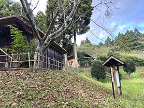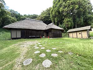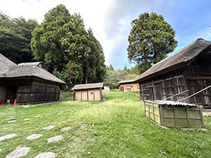二軒とも、かすみがうら市の牛渡地区にあったもので、平成4年に移築復元。 「住宅」(奥)は1700年代初頭、「板倉」(手前)は天保14年(1843)の建築。 「板倉」は、壁が板張りで出来た倉をいい、穀物などを収納した。小屋裏が二階になっており、茅葺屋根の原型が残る貴重な遺構だった。
