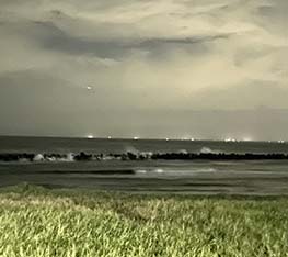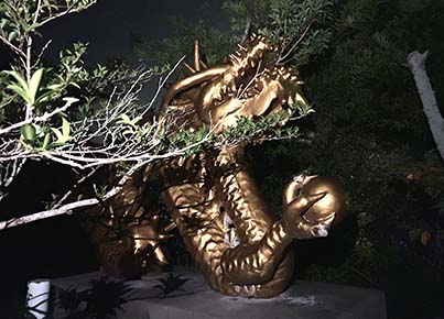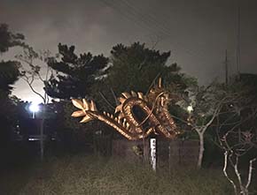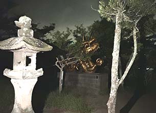 近年、時々通る近隣の道路に面した神社が、真夜中の境内に、明かりを灯した大きな灯篭を出していて、帰途の遅い学生さんやOLさんには心強かろう、と思っている。 ウチあたりは、この海辺の村に比べれば、だいぶ都会の住宅密集地だが、賑わいは、夜間営業の飲食店や酒場に限られ、空き地の森や、公民館の庭、神社の境内なんかは真っ暗で、悪意の犯罪者に好都合の場は至る所にある。 神社の境内では誰も悪さをしなかったのは昔で、近頃は神社の賽銭箱から銭を盗む不届き者が報じられる。 そんな闇の中、金龍に突然出くわしたら、なんだ、これは、何か仕掛けがあるのでは、と驚かす程度の効果はあるかもしれないし、海神に守られている心強さも感じた。