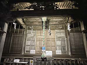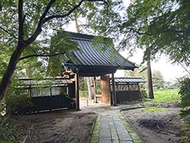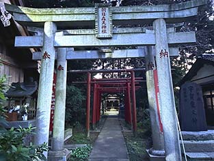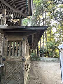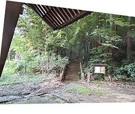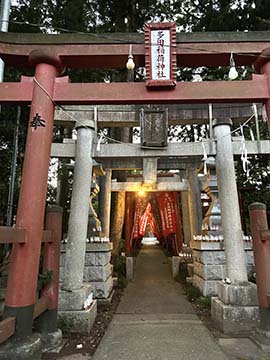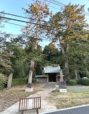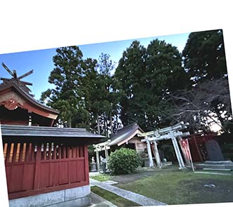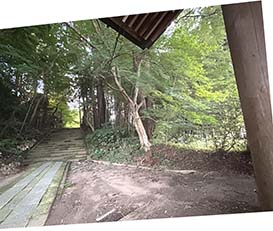この神社については、一つの手がかりとして、江戸時代に到って、神社を再興・遷座したり、遷座し直したりしたという「八幡山光明院」を検索すると、同じ香取市多田地区のお寺のようで、「平将門を弔うために多田満仲が建立した」という伝承があるらしい。 ……ちなみに、史実における満仲は、平将門を追討しに来た(が討つ前に将門の追討は終わっている)源経基の子である。(将門後裔を自称する千葉氏の主君、源頼朝の先祖でもある) 社殿の裏側にも何やら鳥居が……(パノラマ2枚)
