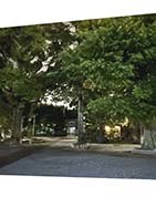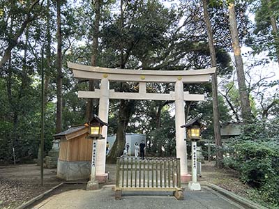 中央の木々は、左右に伸びる参道で、参道の左に正面鳥居、右に本殿という構図。