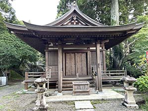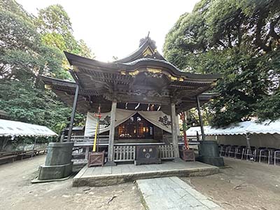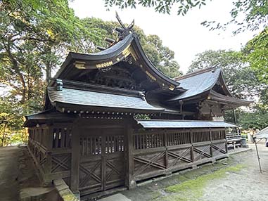 社殿によると景行天皇紀40年(110)、日本武尊が東征の際、玉の浦の東端、玉が崎に創祀。中世は下総国二宮とも称され、龍王崎の地にあったが、天分年間に兵火に遭い、積年の海蝕を避け、現在地に移したと伝わる。 上総国一宮(玉前神社)とともに九十九里浜を鎮護する神社として広く崇められ、漁業関係者はじめ、過去には国学者の平田篤胤なども参拝し、多くの人々の信仰を集めている。 本殿は元禄10年(1697)頃の建築だが、中世末の様式が残る。拝殿は嘉永5年(1852)の再建。両殿とも、平成29年から令和2年にかけて半解体修理を行っている。 案内板には、地域に古くはあった(最近は行われない)風習として、台風に備え、「風切り鎌」と称した「草刈り鎌」を家の棟に取り付けたり、収穫前の稲を一株切り取り、お供えする事が書かれてました。