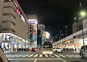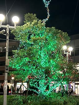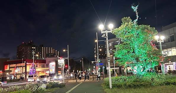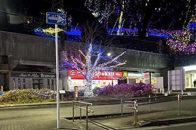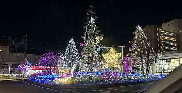 車内から撮ったんで、窓ガラスに別のイルミネーションが写ってしまったが、寒いのと人通りが多くて、急いで通り過ぎないとならないので、窓開けもせずで(^_^;)ゞ (こういうの気を付けないと、ガラスや鏡に映る情報も近頃はヤバイんだよねー) これがガラスにも写ってた駅前の豪華なイルミ(地図)